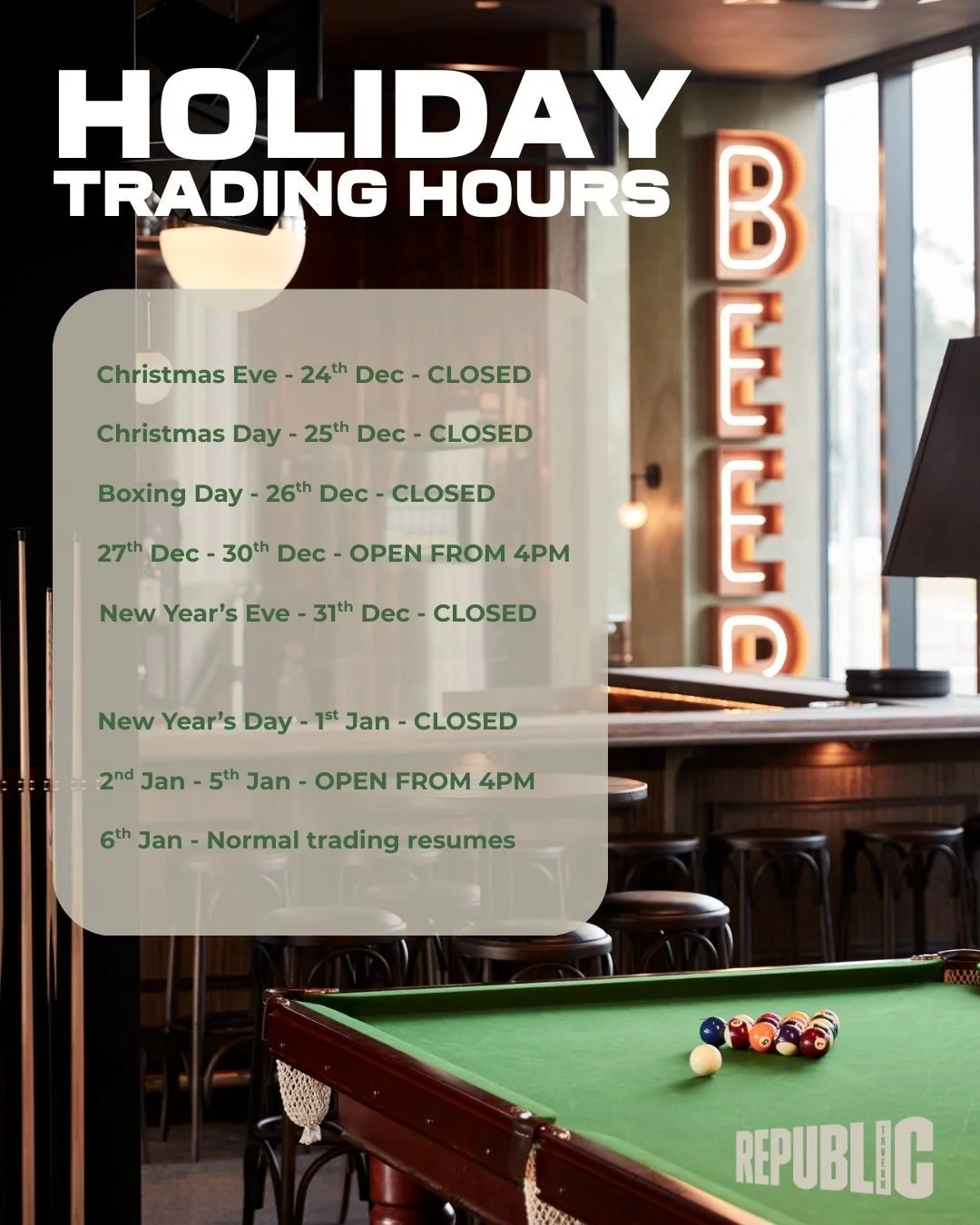 Limited trading applies from 27β30 Dec and 2β5 Jan, with a reduced menu and doors opening from 4pm.